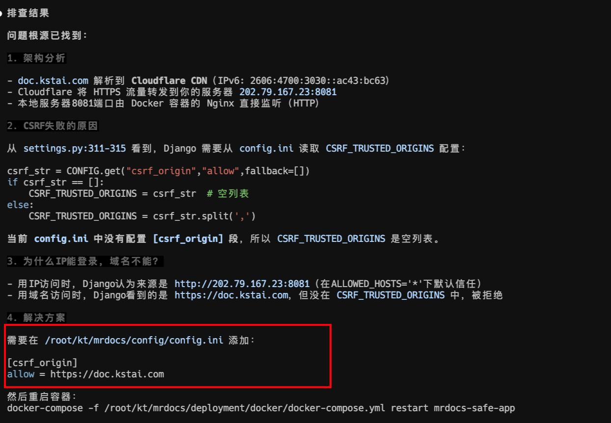 # Q:将服务解析到新域名,接口CSRF错误❓ A:解决方案:有新域名解析到MrDoc的话,需要在这个配置文件增加csrf_origin ,然后重启服务