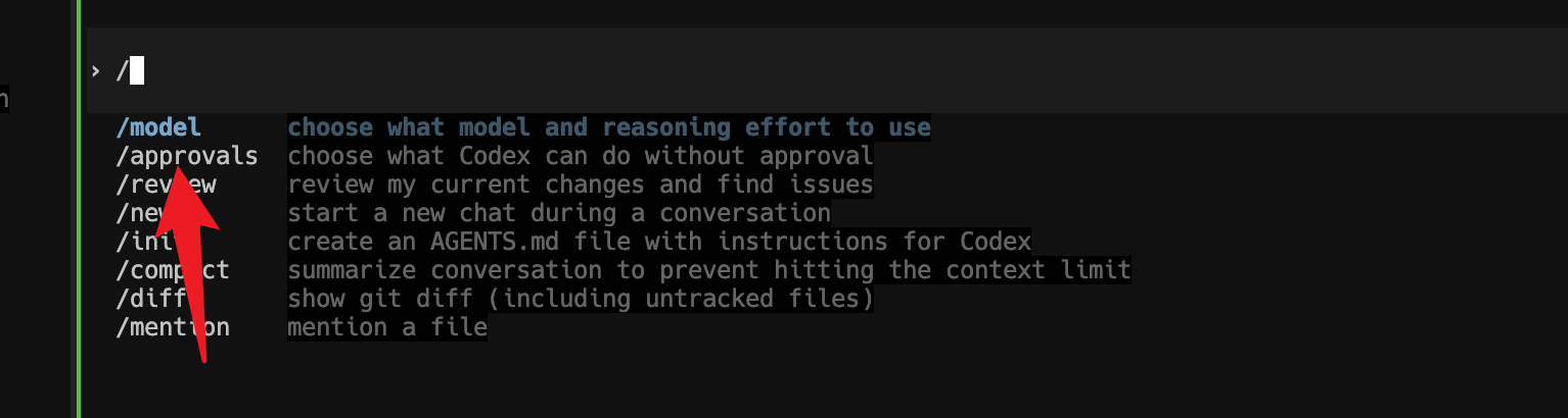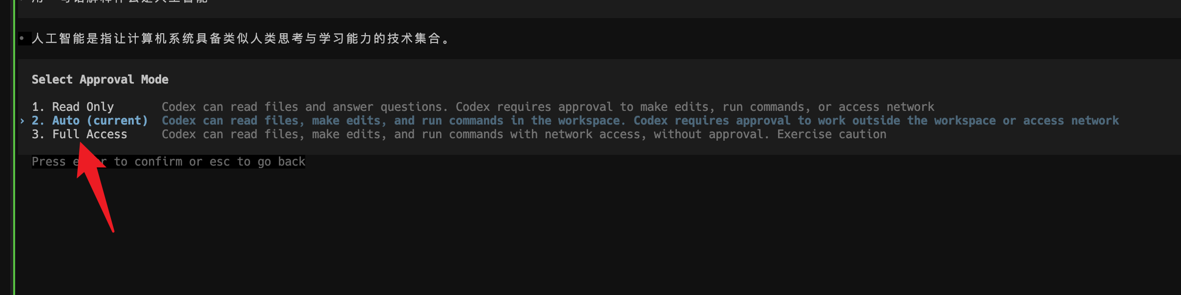 登录到codex后 输入框输入 /  选择approvals 选择选项3  敲回车确认即可